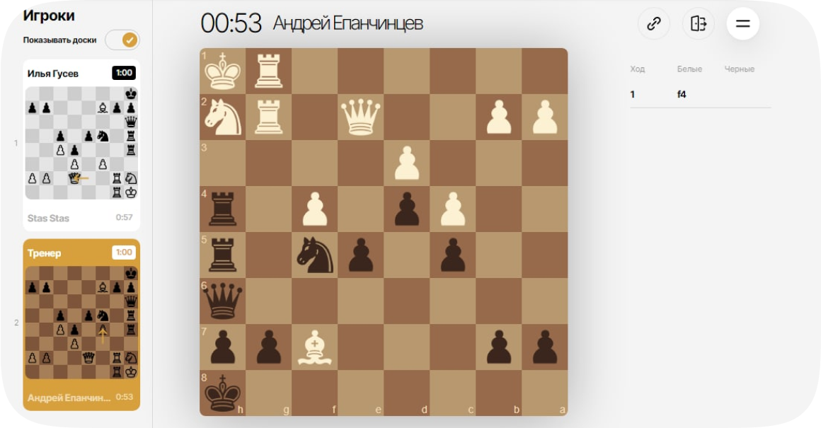 Обычно в Zoom ученик видит только экран тренера и не может сам сделать ход. наша платформа интерактивная: ребёнок сам делает ходы и предлагает ходы-кандидаты